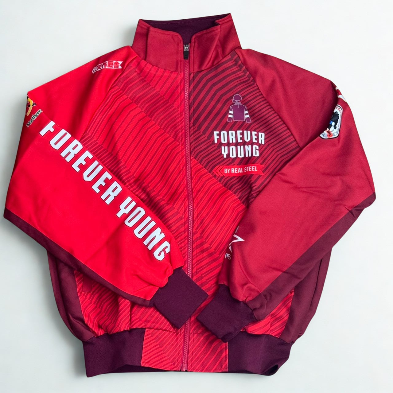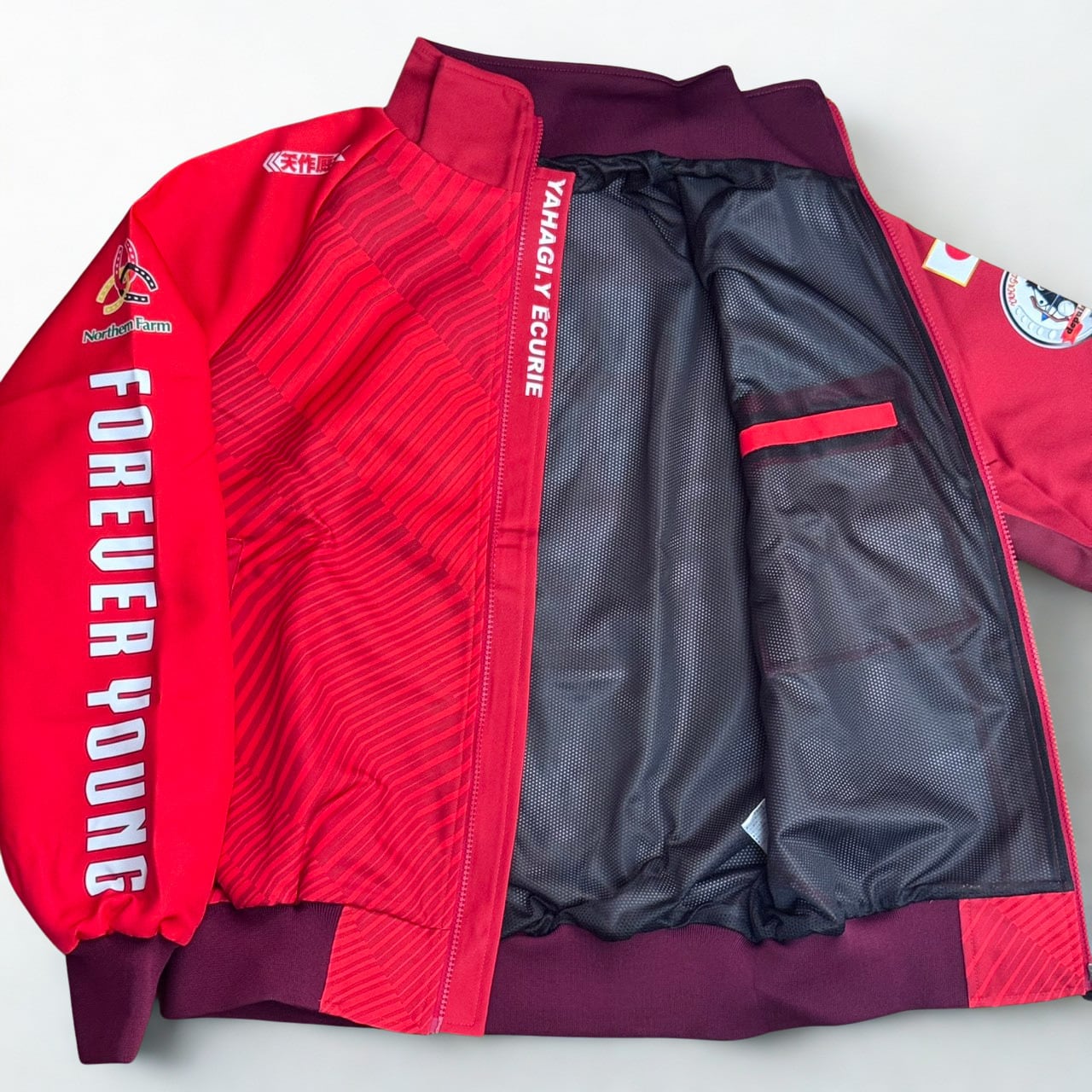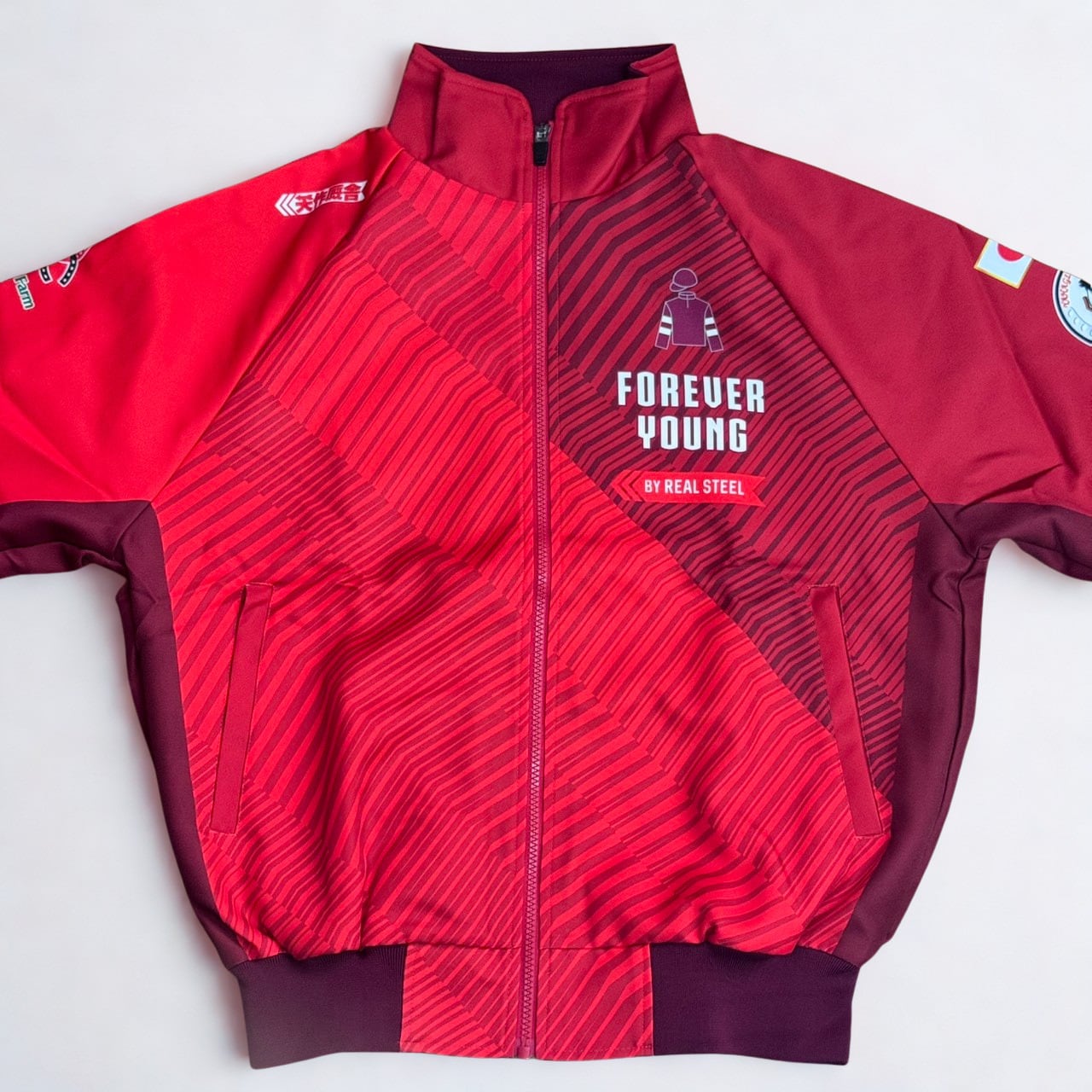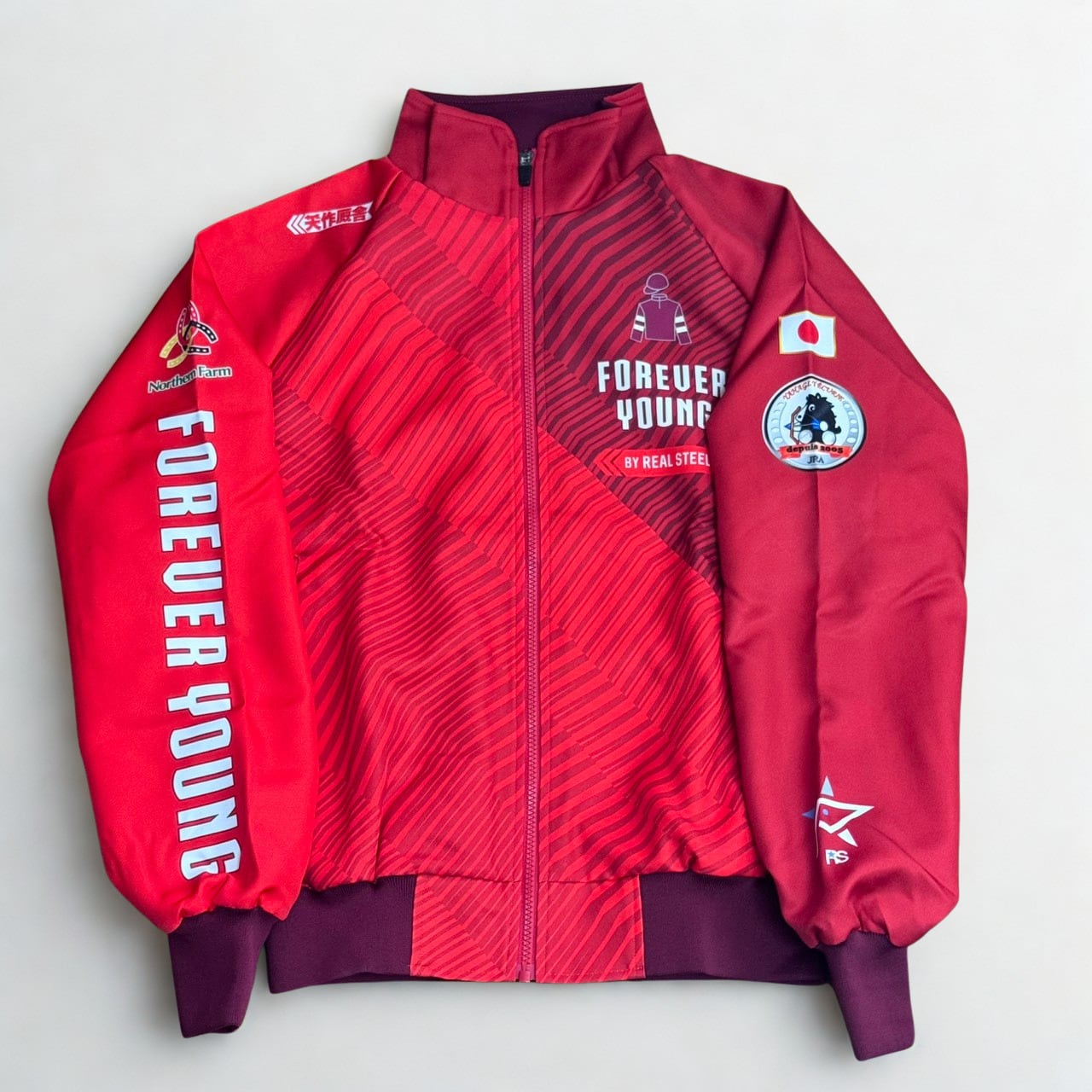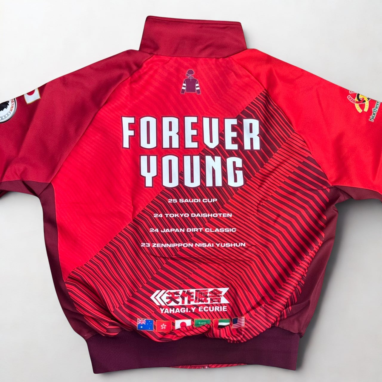 フォーエバーヤング号の2025年サウジカップ優勝を記念して製作された、矢作厩舎オリジナルのブルゾンです。